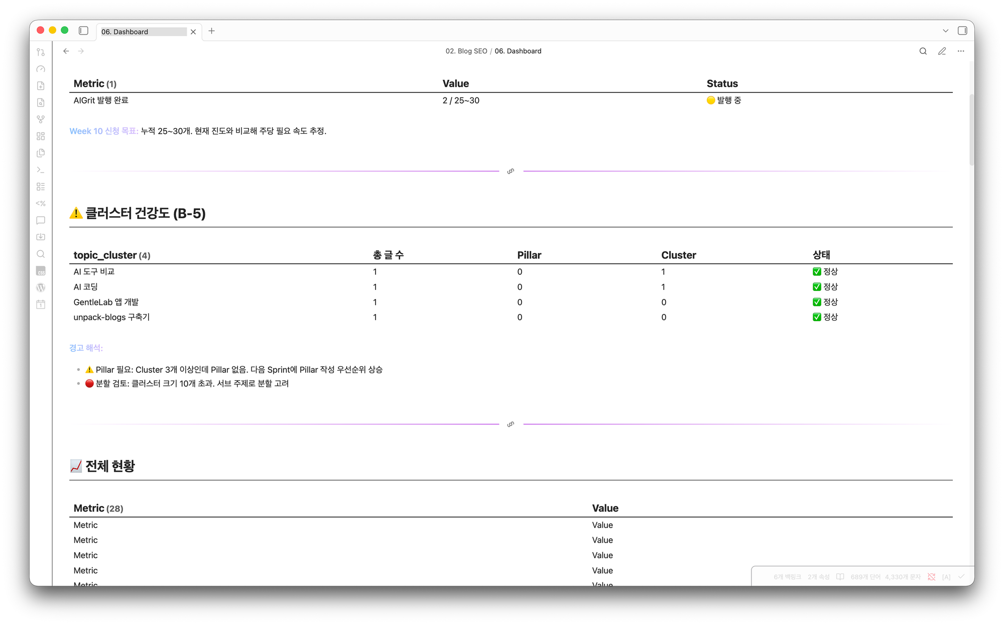실제로 Sprint 1주차 회고에서 언급한 "Obsidian SEO 관제 시스템이 과했을 수도"의 주인공이 바로 이 시스템이다. 만드는 재미는 있었지만 글 0개 시점의 투자 타이밍이 아쉽다.