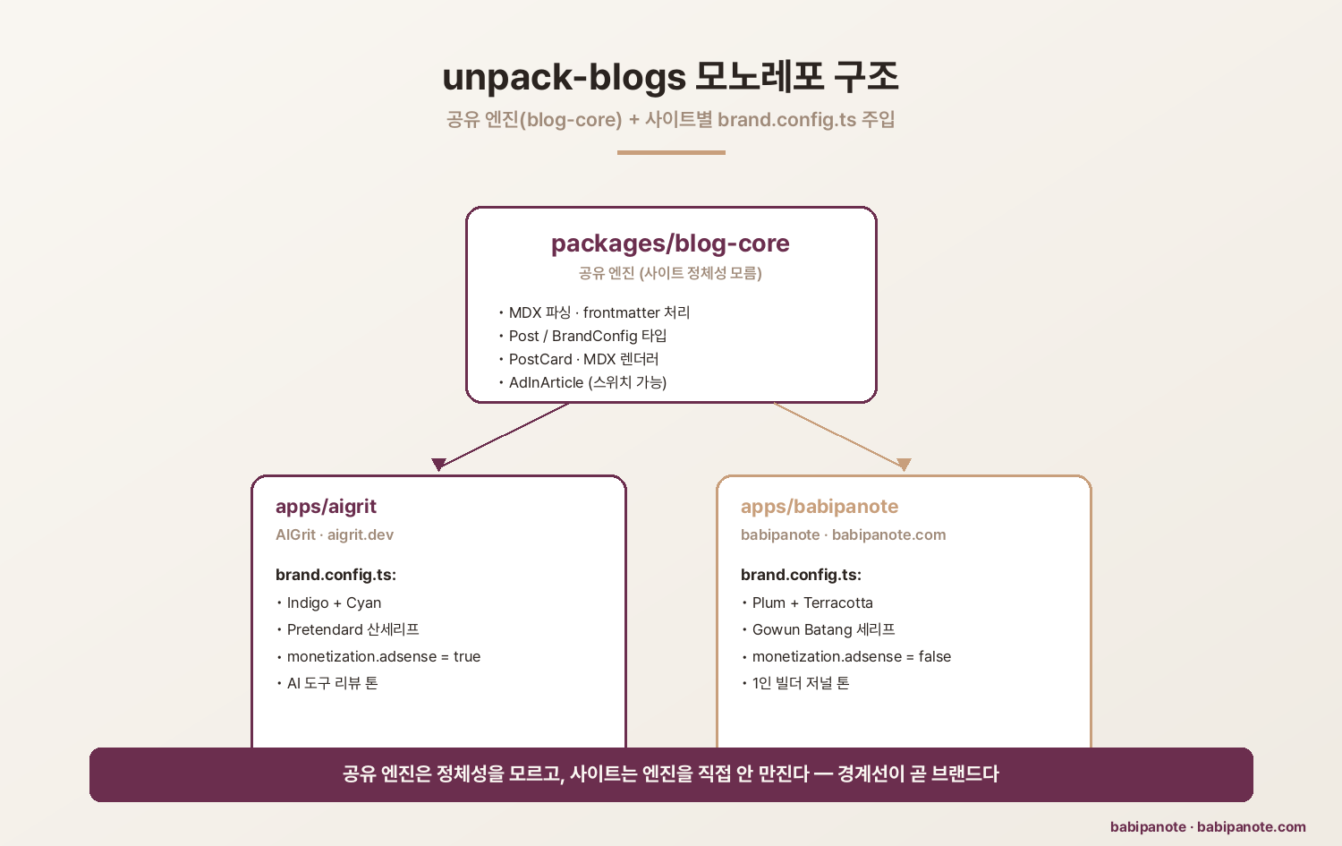 packages/blog-core 안에는 사이트 정체성에 무관한 코드만 들어간다. lib/mdx.ts, components/blog/PostCard.tsx, components/ads/AdInArticle.tsx 같은 것들. 이 패키지의 코드 한 줄에 "AIGrit" 이나 "#6B2E4E" 가 직접 등장하면 룰 위반이다.